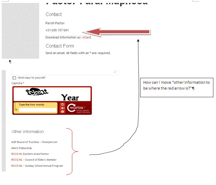 How can l change the position of the "other information" which is currently under the captcha, to be under the contact info at the top. See attached image