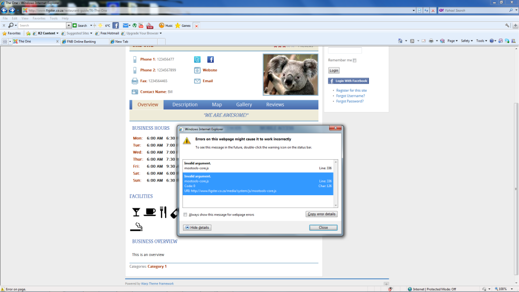 I was getting a conflict error on my site in IE. I installed jquery easy and enabled, but still getting the error. Can you suggest some tweaking I might need to do in the advanced config section or anything else that might help. Attached is a screen shot of the error.[url=http://http://www.figster.co.za/restaurant-guide/76-The-One]Link to my site[/url]