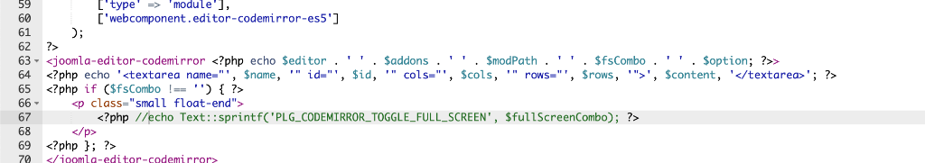 To fix this I commented out line 67 in this file /plugins/editors/codemirror/layouts/editors/codemirror/element.php