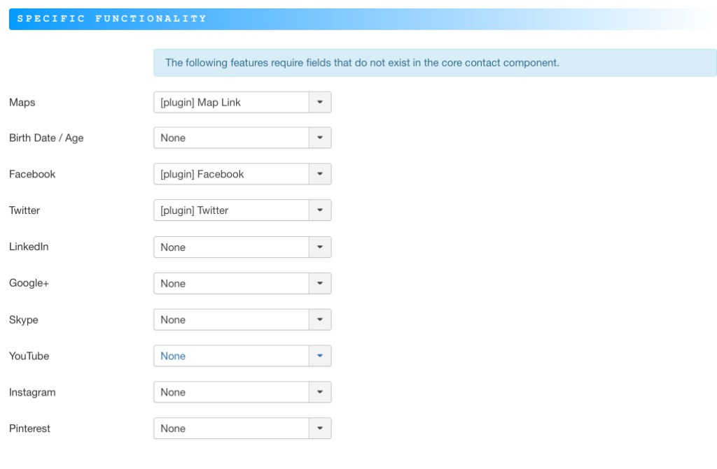 In the Trombinoscope Global options I see below the heading Specific Functionality a range of setings. After Maps it says: [plugin] Map link, like this the fields after Facebook and Twitter refer to the same: [plugin] Facebook and [plugin] Twitter.